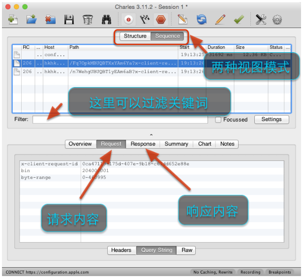 Charles 主要提供两种查看封包的视图,分别名为 “Structure” 和 “Sequence”。