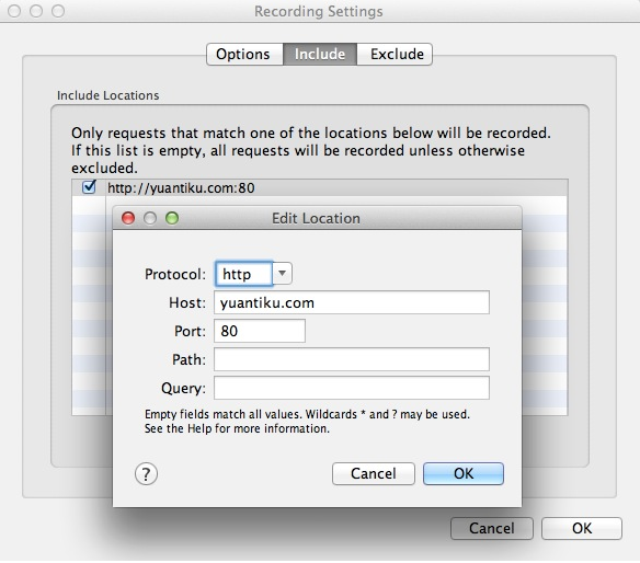 方法二:在 Charles 的菜单栏选择 “Proxy”–>“Recording Settings”,然后选择 Include 栏,选择添加一个项目,然后填入需要监控的协议,主机地址,端口号。这样就可以只截取目标网站的封包了。如下图所示: