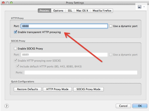 要截取 iPhone 上的网络请求,我们首先需要将 Charles 的代理功能打开。在 Charles 的菜单栏上选择 “Proxy”–>“Proxy Settings”,填入代理端口 8888,并且勾上 “Enable transparent HTTP proxying” 就完成了在 Charles 上的设置。如下图所示: