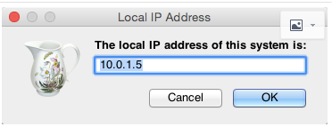 首先我们需要获取 Charles 运行所在电脑的 IP 地址,Charles 的顶部菜单的 “Help”–>“Local IP Address”,即可在弹出的对话框中看到 IP 地址,如下图所示: