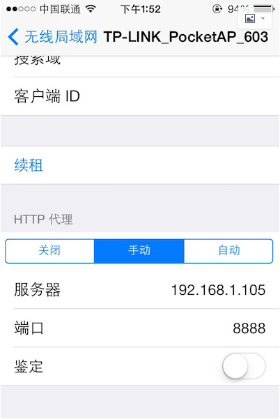在 iPhone 的 “ 设置 ”–>“ 无线局域网 ” 中,可以看到当前连接的 wifi 名,通过点击右边的详情键,可以看到当前连接上的 wifi 的详细信息,包括 IP 地址,子网掩码等信息。在其最底部有「HTTP 代理」一项,我们将其切换成手动,然后填上 Charles 运行所在的电脑的 IP,以及端口号 8888,如下图所示: