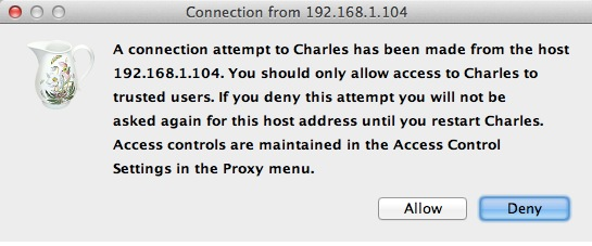 设置好之后,我们打开 iPhone 上的任意需要网络通讯的程序,就可以看到 Charles 弹出 iPhone 请求连接的确认菜单(如下图所示),点击 “Allow” 即可完成设置。