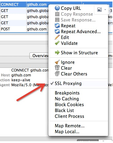 需要注意的是,即使是安装完证书之后,Charles 默认也并不截取 Https 网络通讯的信息,如果你想对截取某个网站上的所有 Https 网络请求,可以在该请求上右击,选择 SSL proxy,如下图所示: