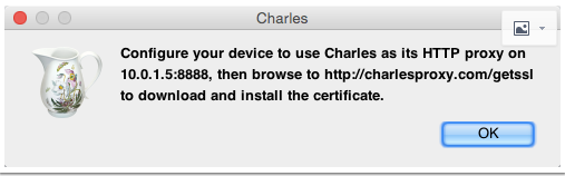 如果我们需要在 iOS 或 Android 机器上截取 Https 协议的通讯内容,还需要在手机上安装相应的证书。点击 Charles 的顶部菜单,选择 “Help” –> “SSL Proxying” –> “Install Charles Root Certificate on a Mobile Device or Remote Browser”,然后就可以看到 Charles 弹出的简单的安装教程。如下图所示: