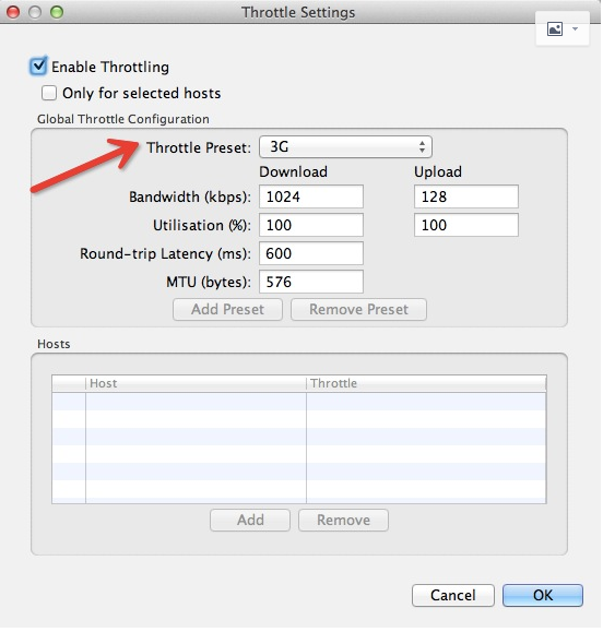 如果我们只想模拟指定网站的慢速网络,可以再勾选上图中的 “Only for selected hosts” 项,然后在对话框的下半部分设置中增加指定的 hosts 项即可。