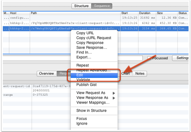 有些时候为了调试服务器的接口,我们需要反复尝试不同参数的网络请求。Charles 可以方便地提供网络请求的修改和重发功能。只需要在以往的网络请求上点击右键,选择 “Edit”,即可创建一个可编辑的网络请求。如下所示: