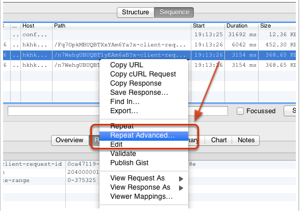 我们在想打压的网络请求上(POST 或 GET 请求均可)右击,然后选择 「Repeat Advanced」菜单项,如下所示: