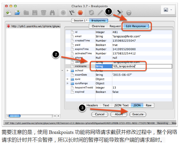 我们可以修改该请求的任何信息,包括 URL 地址、端口、参数等,之后点击 “Execute” 即可发送该修改后的网络请求(如下图所示)。Charles 支持我们多次修改和发送该请求,这对于我们和服务器端调试接口非常方便,如下图所示: