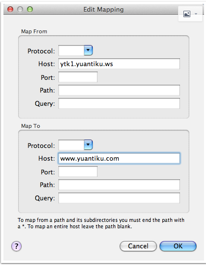对于 Map Remote 功能,我们需要分别填写网络重定向的源地址和目的地址,对于不需要限制的条件,可以留空。下图是一个示例,我将所有 ytk1.yuanku.ws(测试服务器)的请求重定向到了 www.yuantiku.com(线上服务器)。