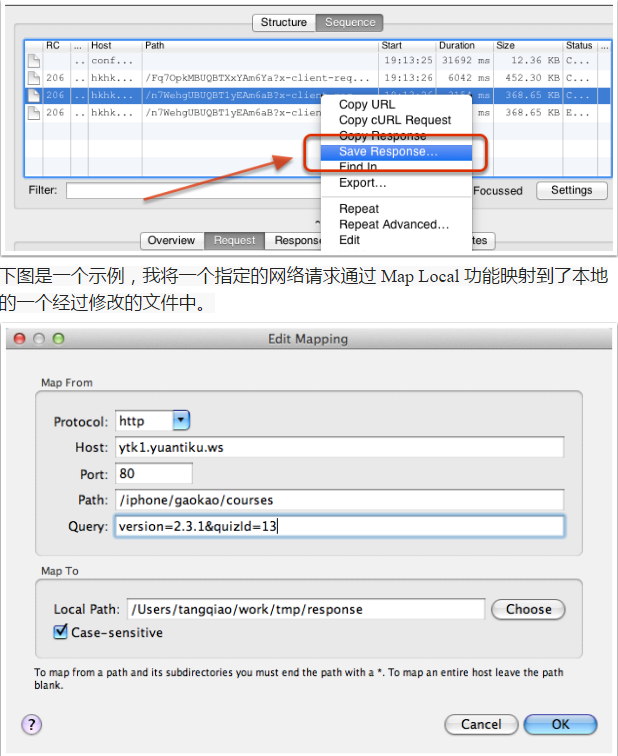 对于 Map Local 功能,我们需要填写的重定向的源地址和本地的目标文件。对于有一些复杂的网络请求结果,我们可以先使用 Charles 提供的 “Save Response…” 功能,将请求结果保存到本地(如下图所示),然后稍加修改,成为我们的目标映射文件。