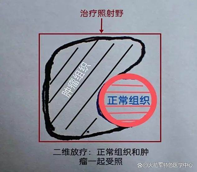 二维放疗是最早的放疗技术,即是人们常说的普通放疗,多采用矩形照射野对穿照射,照射野形状与肿瘤形状明显不同,且包括大量的正常组织,治疗效果较差,副反应大。