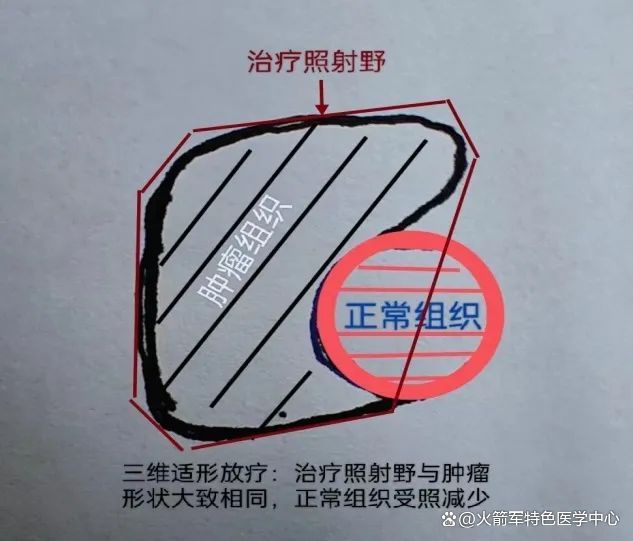 三维适形放疗则是通过在几个方向上设置与肿瘤形状大致相同的照射野,使治疗剂量的分布在三维方向(前后、左右、上下)上均与肿瘤形状大致相同,提高了放疗的精准度,明显减少了正常组织受照,从而提高疗效,降低副反应。