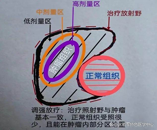 调强放疗则是通过在更多方向上设置照射野,这些照射野在每个方向上都与肿瘤的形状高度一致,从而使治疗剂量的分布在立体空间上与肿瘤形状高度匹配,正常组织受照很少。同时还能够根据治疗需要,在肿瘤内部不同区域给予不同的治疗剂量。这就进一步提高了放疗的疗效,降低了副反应。