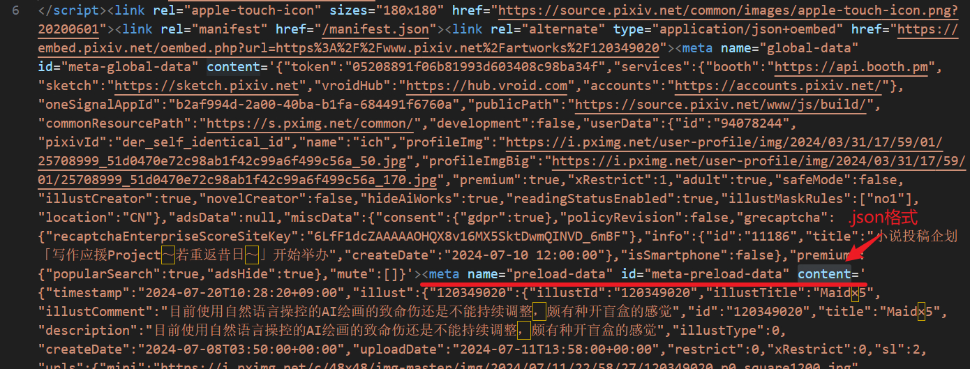 其中的要点是:先用正则表达式找到这张作品的ID,再用这个ID在.json格式的数据里面提取出需要的数据。