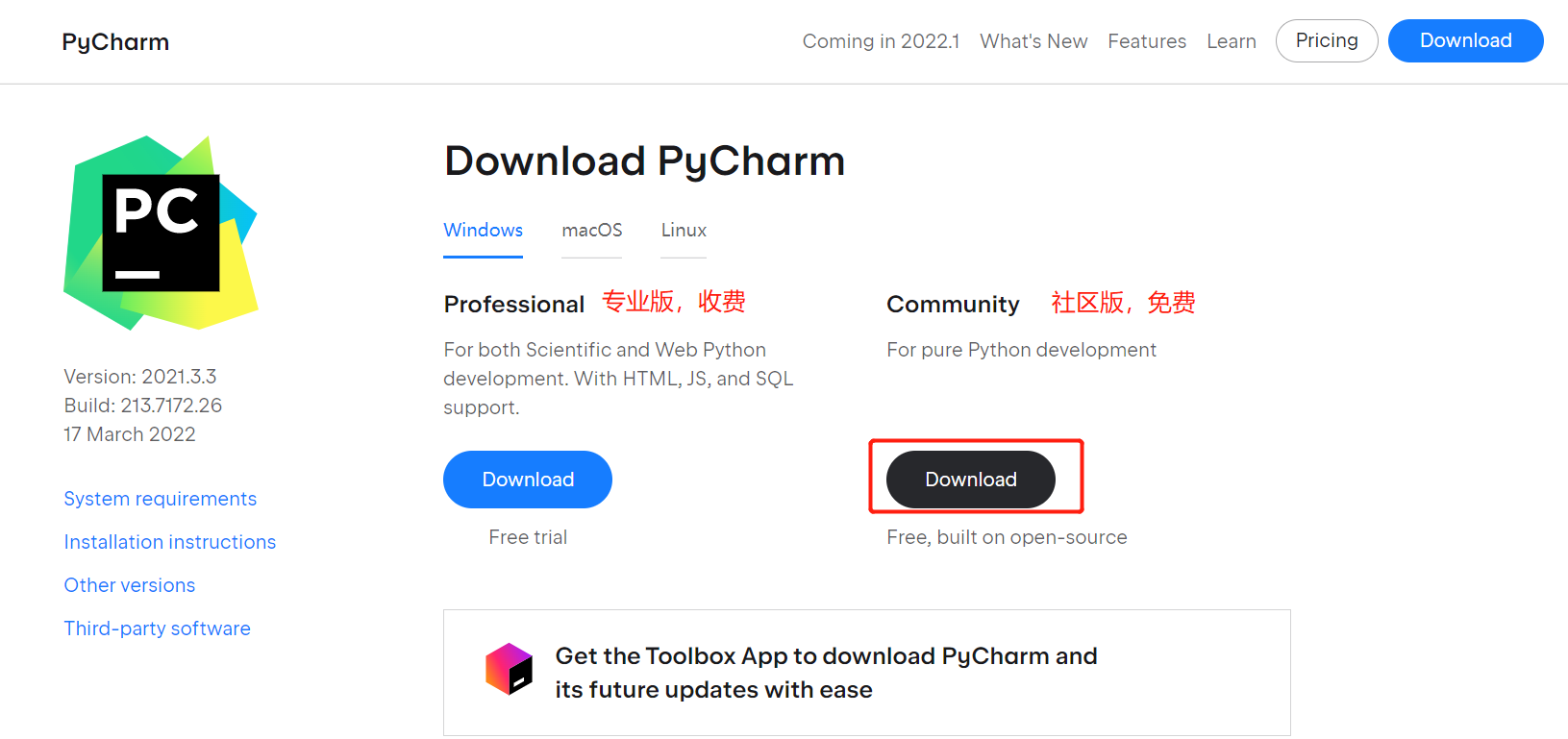 下载安装包:https://www.jetbrains.com/pycharm/download/#section=windows