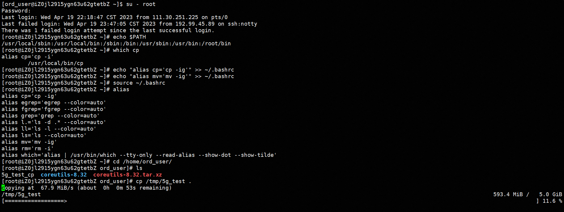 使用dd命令创建一个5G的文件5g_test,验证命令可以显示进度和速度,并且在命令操作完后还会显示平均速度。