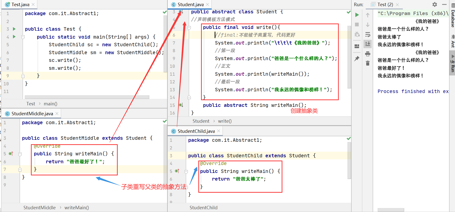- 抽象方法定义通用功能让子类重写,final定义的方法子类不能重写。