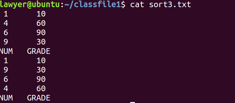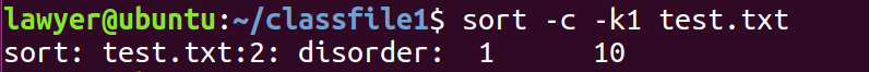 sort -c -k1 test.txt 查看文件是否按要求排好序,可见sort.txt未排好序: