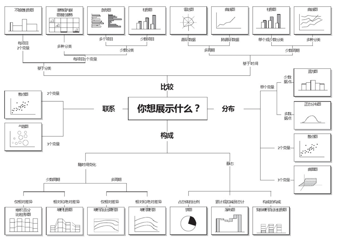 确定了要展现的数据指标之后,下一步就是根据指标分析的场景,选择对应的图表,这里放一张经典的图表选择指导图给大家参考: