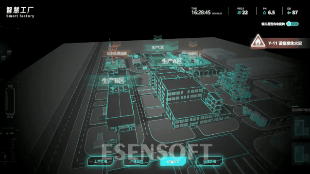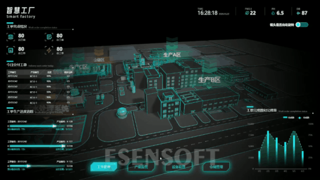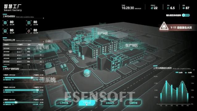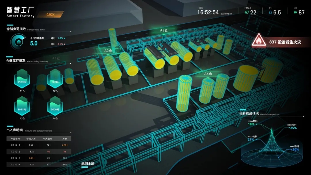 同时实现监控区域三维全景可视化,高度融合工厂现有数据资源,对工单管理、产能监管、设备监管、仓储管理等领域的关键指标进行综合监测分析,辅助管理者全面掌控厂区运行态势。