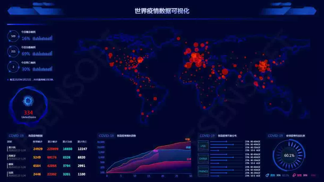 正如在新型冠状病毒疫情攻坚期,众多主流媒体、自媒体等纷纷推出了不同类型的疫情地图,为居民实时了解疫情动态提供了最直观的参考。在此期间,亿信华辰也做了诸多的疫情大屏进行展示,如图所示,通过多种维度展示,利用丰富的图表,我们就可以直观地感受到世界的疫情分布情况以及确诊疑似治愈等重要信息,也能感受到,应对疫情防控,各地已取得了显著成果。
