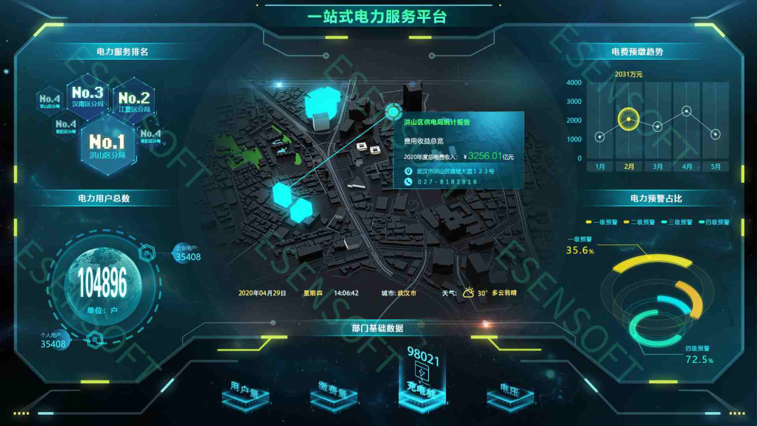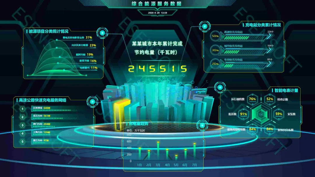 同时亿信ABI的3D可视化技术,不仅仅体现在可无缝集成3D模型,其内置的近百种组件特效,六十余种风格各异的表格、导航、统计图等组件及SVG特效,与3D模型相结合,直观酷炫的呈现城市数据,将整个城市的大数据统一采集处理、挖掘分析,再以丰富的应用形式,开放给城市管理者和社会公众使用,从而实现城市的数字化管理与可持续发展。