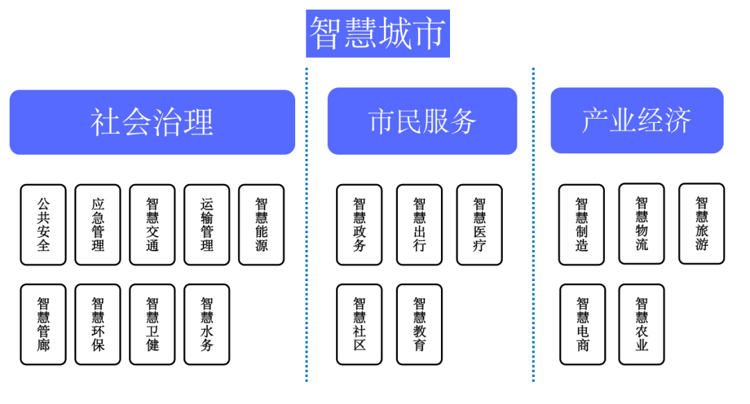 智慧城市是物理系统,数字系统和人文系统在建筑环境中的有效集成。功能体系包括社会治理、市民服务和产业经济三大类别,具体包括市政、能源、政务、交通、卫健、制造和物流等多个智慧应用。