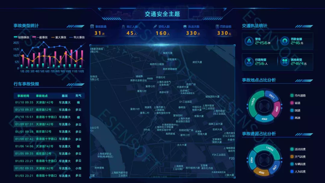 随着交通枢纽的大规模联网,海量车辆通行记录信息汇聚,这对于城市交通管理有着重要的作用。交通大屏集成地理信息系统、视频监控系统、交管部门各业务系统数据,对交通路况、警力分布、警情事件、接处警情况等要素进行综合监测,能够帮助管理者实时掌握交通整体运行态势。