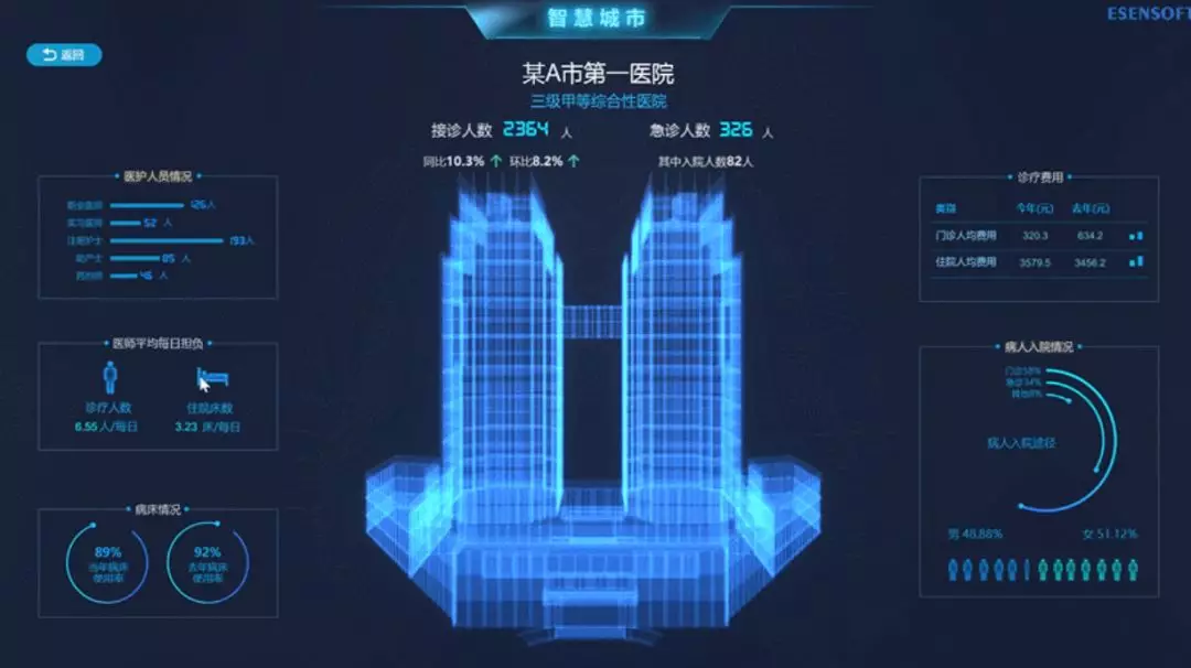同理,点击某三甲医院,我们即可查看医院接诊/急诊人数,医护人员情况、诊疗费用、医师平均日负担、病人如愿情况和病床情况。