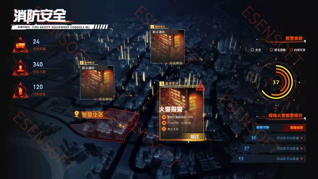消防大屏可基于地理信息系统,可将城市街道、地标点、建筑物、基础设施、视频数据等要素信息进行详细的展现,实现管辖区域内“人、车、地、事、物”的全面监控,辅助消防部门综合掌控大范围城市消防态势。同时也可对场所重点部位、警力资源、告警事件等消防要素的实时状态进行可视化监测,辅助用户掌控微观消防态势。