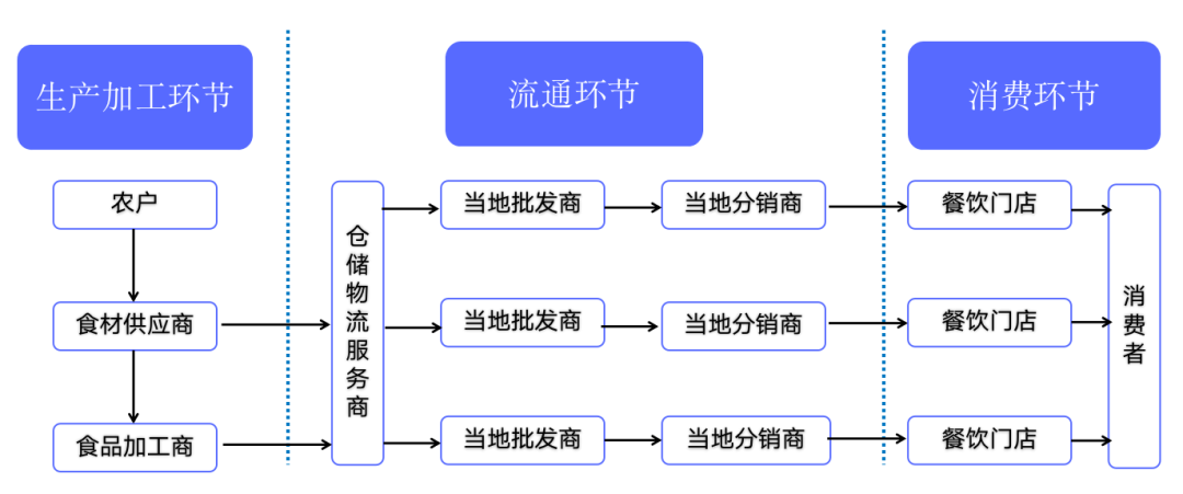 在餐饮供应链上,包括种植/养殖、食品加工、物流、仓储等诸多环节。当下,由于信息不对称,上下游难以联动,规模化程度低等因素,导致从农场到餐桌“战线”长且不透明,成本高且不利于监管,进一步制约着供应链的发展。