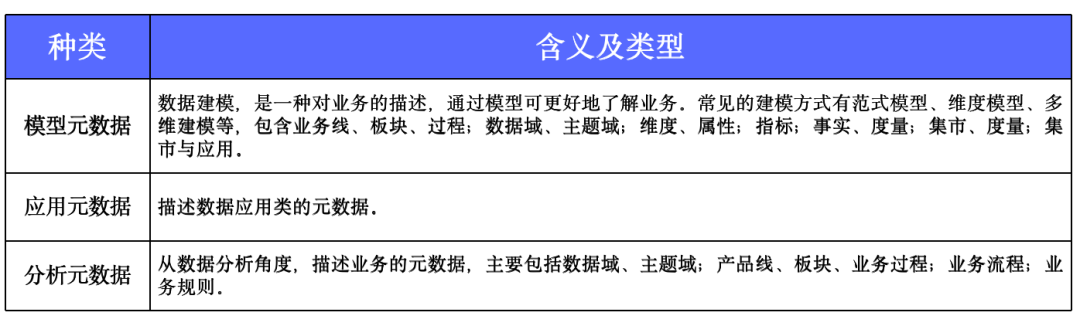 元数据按照其描述对象的不同可以分为三大类,分别是“技术元数据”、“业务员数据”、“管理元数据”。