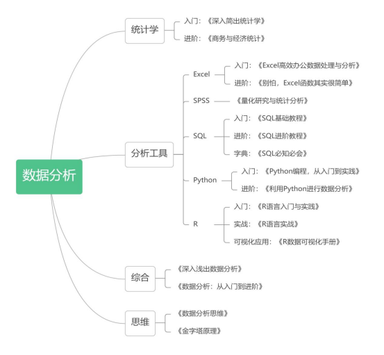 今天小亿给你介绍一个保姆级别的规划,即一份书单,帮助大家自学数据分析。先上一个思维导图,方便大家收藏。(最后附带一些相关学习网站,方便大家学习)