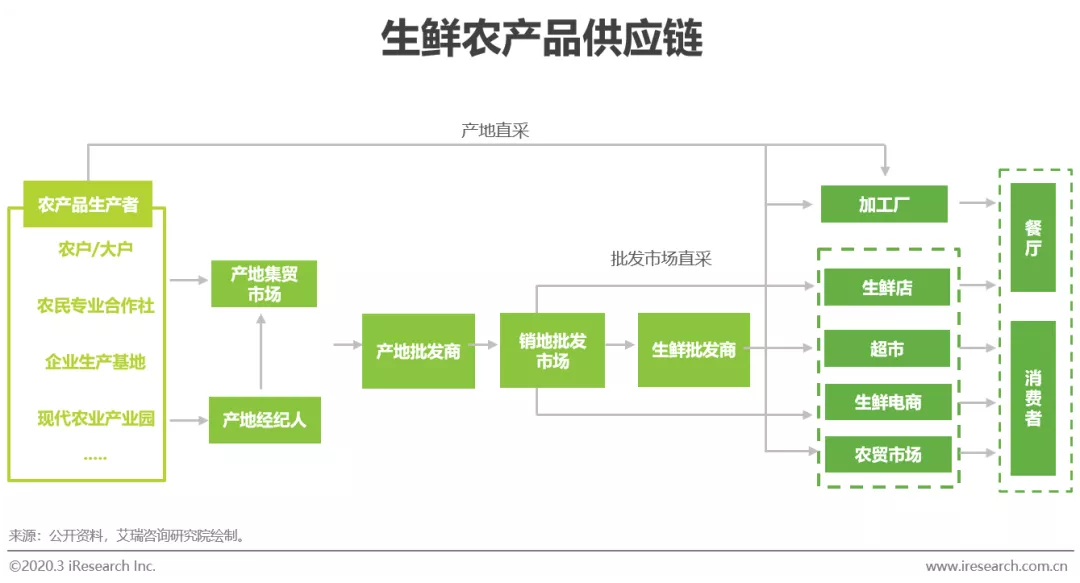 传统分销供应链模式下,生产者与消费者相隔多层分销环节。各级批发市场的规模悬殊较大,使得各环节的流通速率、储存条件大相径庭,而繁琐的链条也削弱了从业者的盈利能力,比如在生鲜分销供应链中,会出现生鲜品的加价和耗损,其中蔬果类总体耗损率最高,从而提高了生鲜的价格。