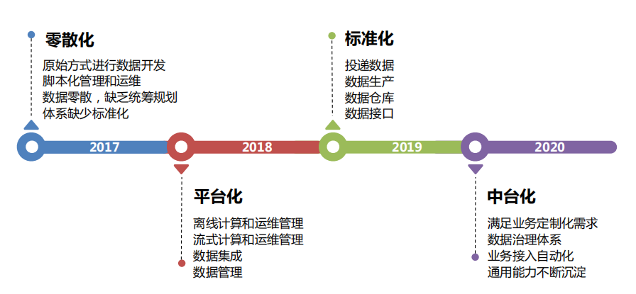 建设数据中台要遵循企业数字化进程各阶段的要求,因此,企业数字化发展可以分为数据汇集、融合、开放、智能化处理几个阶段。