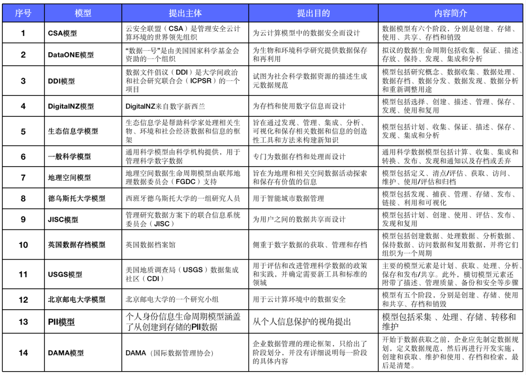 数据生命周期管理模型定义了一个宏观的框架,它是从生产阶段到消亡阶段的数据生命的全景视图。但是,因为数据有很多自身的特点,又不完全相同,因此,在数据管理领域,学术界和企业界的许多研究人员提出了不同的数据生命周期管理模型,如下图所示:
