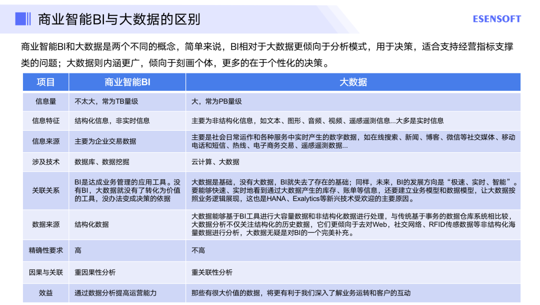 商业智能BI和大数据是两个不同的概念。BI相对于大数据更倾向于分析模式,用于决策,适合支持经营指标支撑类的问题;大数据则内涵更广,倾向于刻画个体,更多的在于个性化的决策。