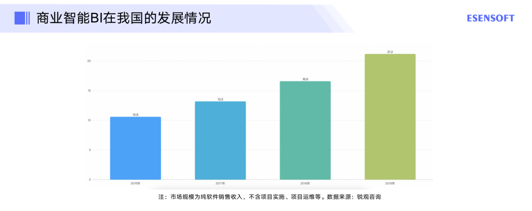 这背后的原因是:从我国开始实施国家大数据战略以来,大数据BI行业保持着高速稳定的发展。一方面得益于国家政策的牵引,如《大数据产业发展规划(2016-2020年)》等利好政策,对打造“数据、技术、应用与安全协同发展的自助产业生态体系”做了全方位的支撑和部署。另一方面,持续多年的信息化应用价值教育,企业自身信息化建设的准备,都让更多企业开始使用BI产品,期望通过精细化运营来提升经营效益。