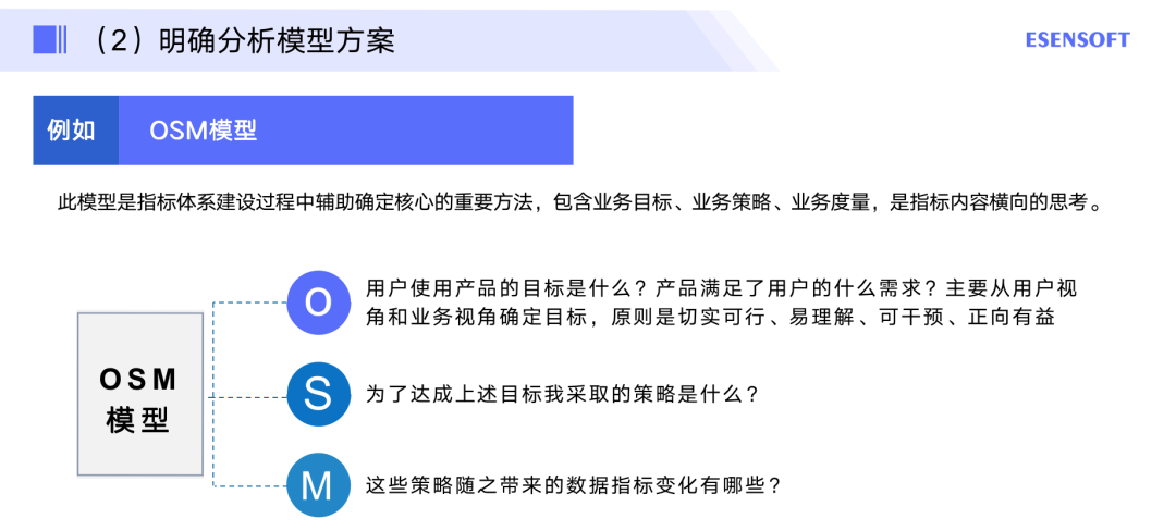 比如:OSM模型。此模型是指标体系建设过程中辅助确定核心的重要方法,包含业务目标、业务策略、业务度量,是指标内容横向的思考。