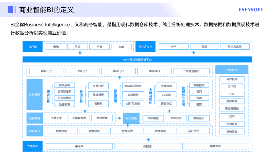 对企业来说,商业智能BI不能直接产生决策,而是利用BI处理后的数据来支持决策。核心是通过构建数据仓库平台,有效整合数据、组织数据,为分析决策提供支持并实现其价值。