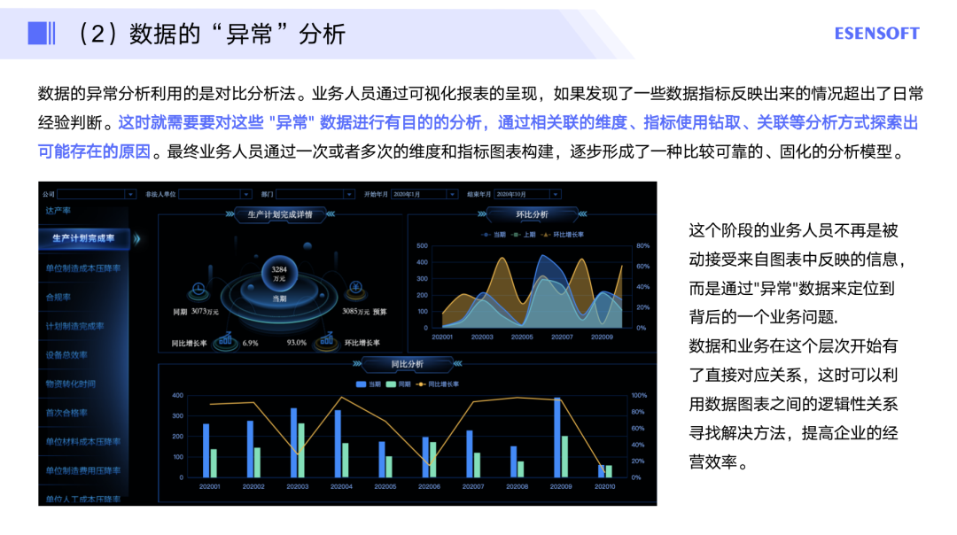 最终业务人员通过一次或者多次的维度和指标图表构建,逐步形成了一种比较可靠的、固化的分析模型。这个阶段的业务人员不再是被动接受来自图表中反映的信息,而是通过"异常"数据来定位到背后的一个业务问题,数据和业务在这个层次开始有了直接对应关系,这时可以利用数据图表之间的逻辑性关系寻找解决方法,提高企业的经营效率。