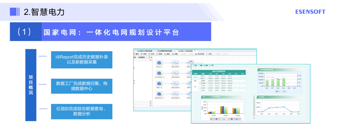 一体化电网规划设计平台借助亿信华辰的i@Report快速搭建数据采集补录平台,并通过数据工厂(EsDataFactory)完成各业务系统数据的整合清洗,并结合亿信ABI实现大规划、大建设成果的集中展示。