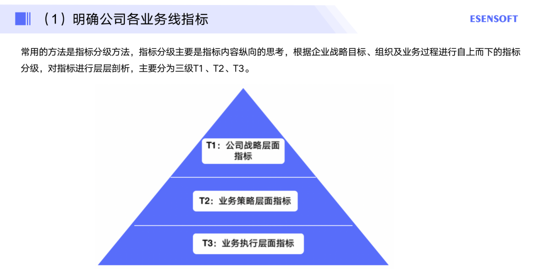 常用的方法是指标分级方法,指标分级主要是指标内容纵向的思考,根据企业战略目标、组织及业务过程进行自上而下的指标分级,对指标进行层层剖析,主要分为三级T1、T2、T3。