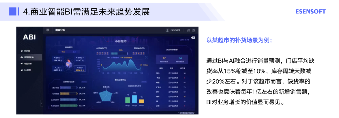 以某超市的补货场景为例,通过BI与AI融合进行销量预测,门店平均缺货率从15%缩减至10%,库存周转天数减少20%左右。对于该超市而言,缺货率的改善也意味着每年1亿左右的新增销售额,BI对业务增长的价值显而易见。随着业务价值不断凸显,企业对BI+AI融合进行智能预测的需求也将持续增加。