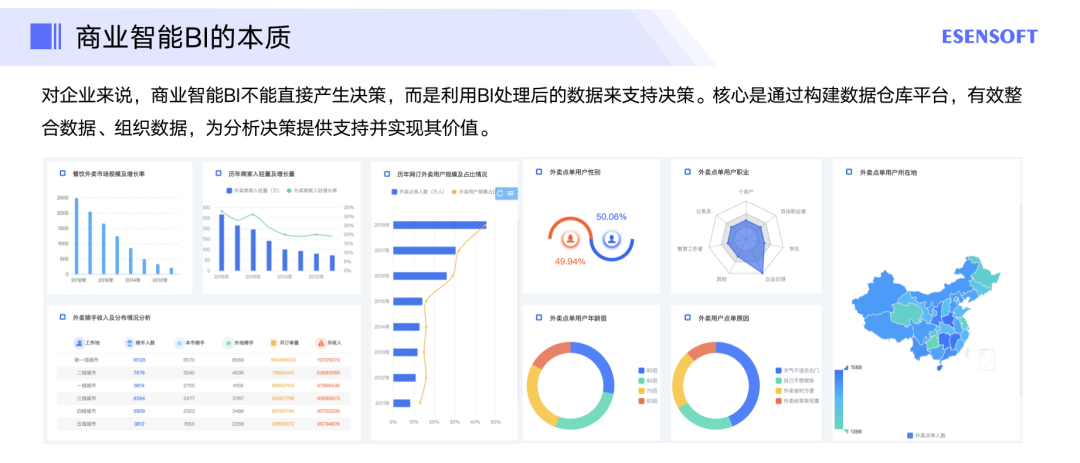 2.BI最终展现给用户的信息就是可视化报表或视图。需要注意的是,报表只是一种呈现,只能达到查询的效果,查询仅仅只能告诉我们结果是什么、有没有问题。而基于可视化图表背后的数据分析才能告诉我们问题的原因是什么,只要问题发现了,原因也找到了,那么企业业务人员或者管理人员如何去决策就会变得简单与轻松。