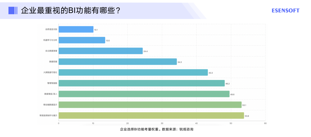 对于BI的功能,企业主要看重报表能力、移动端、填报录入、管理驾驶舱等。超过半数的企业非常重视常规报表制作与展示和移动端BI功能。近一半的企业期待用数据填报来解决企业内部数据采集和录入的问题,数据填报也是解决数据分散在Excel、Word中的有效方法。