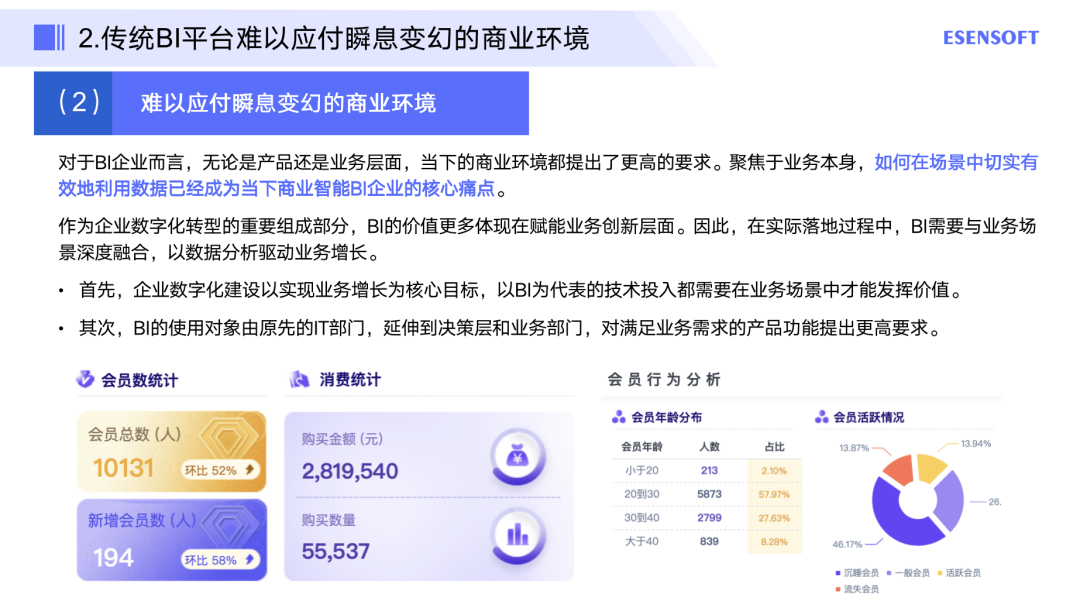 对于BI企业而言,无论是产品还是业务层面,当下的商业环境都提出了更高的要求。聚焦于业务本身,如何在场景中切实有效地利用数据已经成为当下商业智能BI企业的核心痛点。