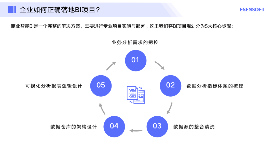 商业智能BI是一个完整的解决方案,需要进行专业项目实施与部署。这里我们将BI项目规划分为5大核心步骤: