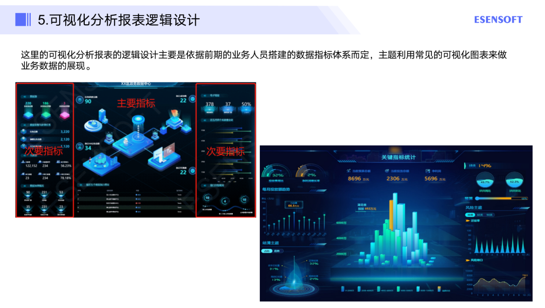 这里的可视化分析报表的逻辑设计主要是依据前期的业务人员搭建的数据指标体系而定,主题利用常见的可视化图表来做业务数据的展现,比如主要指标可以放在可视化报表的中间,次要指标放在两边。当然面对不同的场景,还有许多不同的展示策略,就不一一展开了。