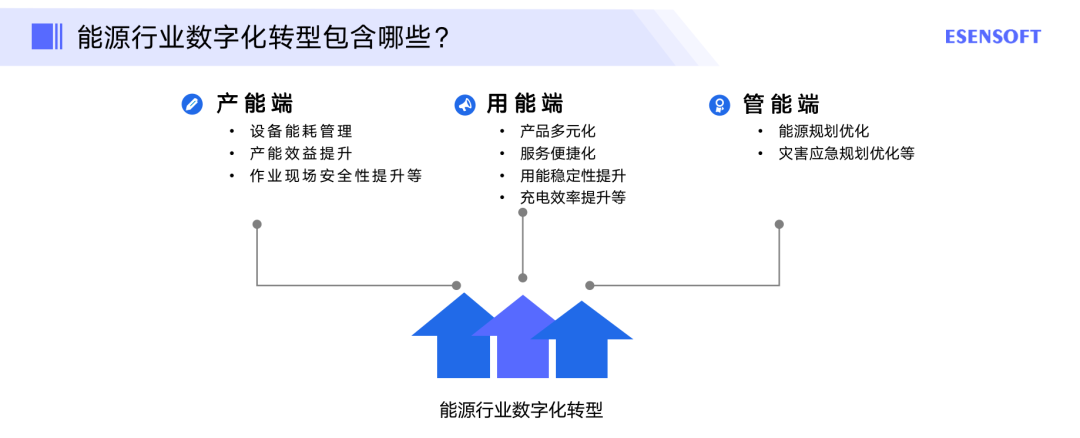 在产能端,通过数据实现设备能耗的管理,产能效益的提升;在用能端:通过数据实现产品多元化,用能稳定性提升;在管能端:通过数据实现能源规划的优化,和灾害应急的规划优化。